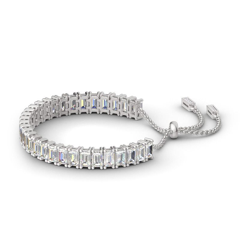 Illuminate her wrist with the lavish look of this gleaming sterling silver adjustable tennis bracelet. A row of emerald stones radiate optimal shimmer. Uniquely designed, each shimmering stone is set to appear extra large and more brilliant, creating twice the sparkle. Held together with a bolo clasp, this bracelet is a chic mix of glamour…
