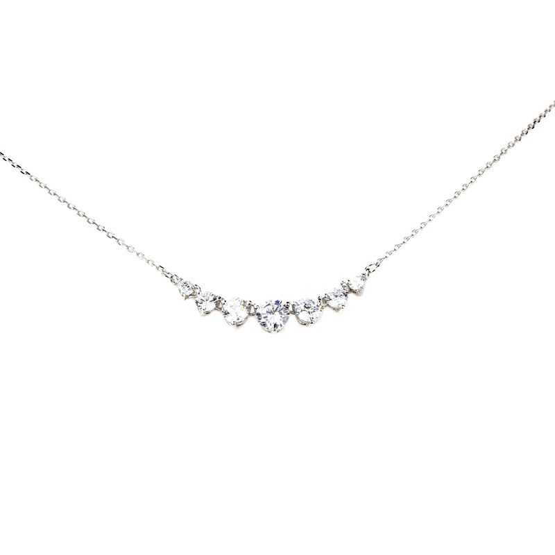 Create a wonderful memory when you present this glimmering necklace to the one you love. Regal and radiant, this necklace is perfect for that special evening out. It showcases seven shimmering round stones, graduating from smallest to largest to smallest, are arranged in a clever chevron pattern, creating this eye-catching style. Setting Information Metal :…