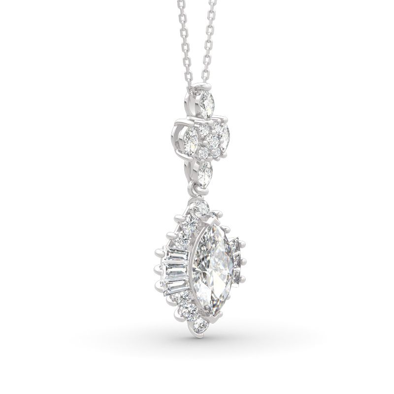 Celebrate one of the most unforgettable moments of your life with this joyous expression of love. This shimmering necklace features a marquise cut stone wrapped in a halo frame of baguette and round stones. Glittering in bold brilliance, additional stones add more sparkle. All the stones sparkle perfectly from every angle, making this necklace an…