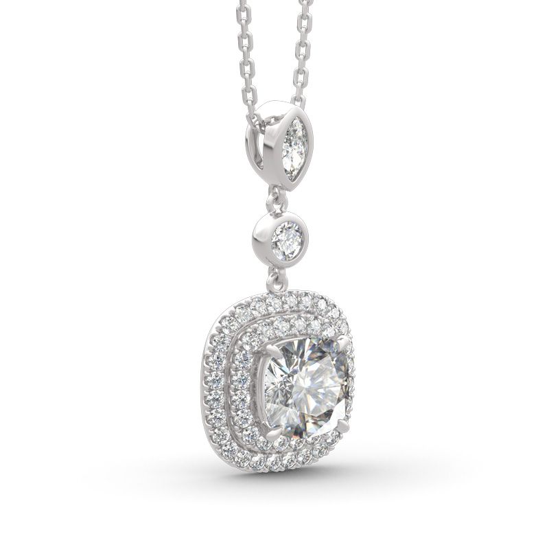 A smart choice you’ll want to wear day after day, this sparkling necklace speaks to your classic sense of style. Crafted in sterling silver, it features a shimmering cushion cut center stone wrapped in sparkling double halo frames, bringing out it’s beauty and sparkle. Whether it’s for a special gift or a treat for yourself,this…