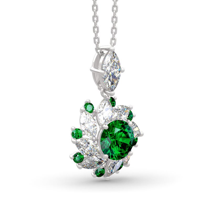 Exquisite and stunning, this necklace will capture your heart at first sight. Inspired from ballerina’s flying skirt, it presents an elegant silhouette that will remain endlessly enchanting. Glistening double halo surrounds the emerald green center stone to create a sparkling and luxurious look. Crafted in sterling silver, it’s durable and comfortable for daily wear. Add…