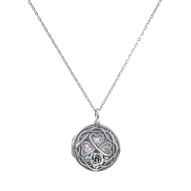 Celebrate your life with this stunning necklace. Crafted in oxidized silver, the pendant necklace shows unique and pristine beauty with its exquisite workmanship. The surface of the pendant is sculptured in a rose and three hearts surrounded by intertwined carvings. In the inside of the locket, there’s a polished disc where you can leave your…