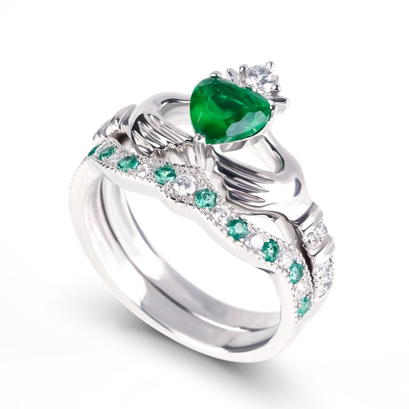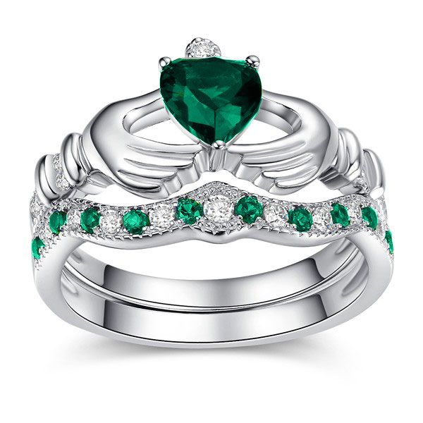 Celebrating love, beauty and Irish culture, this claddagh ring set will capture your heart at first sight. Crafted in sleek sterling silver, the ring features an emerald green heart center stone set on a high polished shank. The traditional claddagh ring is a meaningful token of loyalty, friendship and love. The hands represent friendship, the…
