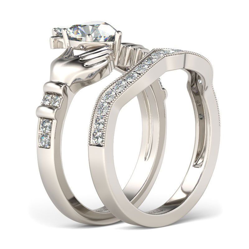 Celebrating love, beauty and loyalty, this claddagh ring speaks right to her heart. Fashioned in sleek sterling silver, this traditional claddagh ring is centered with a shimmering heart stone. A meaningful token, the hands represent friendship, the heart represents love and the crown represents loyalty. On your wedding day, a coordinating shimmering band complements the…