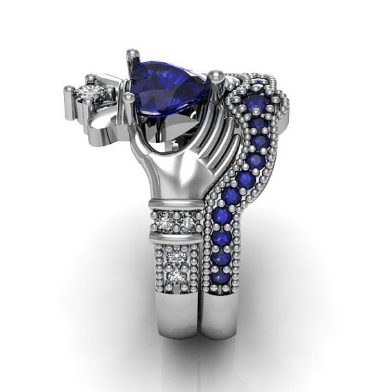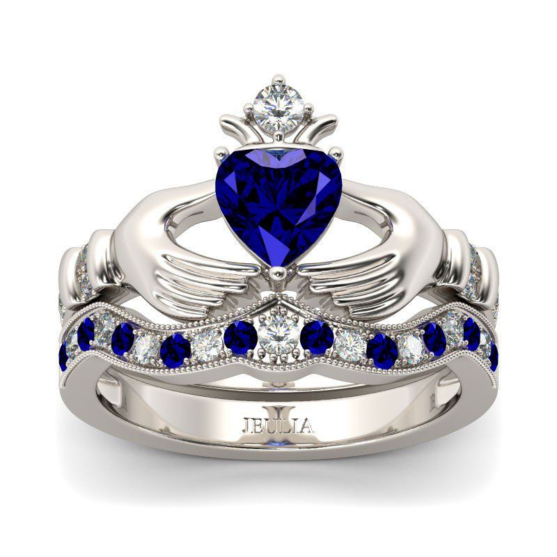 Celebrating love, beauty and Irish culture, this claddagh ring set will capture your heart at first sight. Crafted in sleek sterling silver, the ring features a sapphire blue heart-cut center stone set on a high polished shank. The traditional claddagh ring is a meaningful token of loyalty, friendship and love. The hands represent friendship, the…