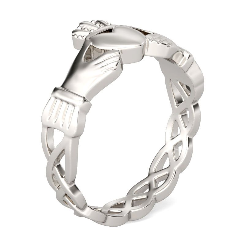 Make the moments magical with this elegant claddagh band. Crafted in sterling silver, the ring showcases the iconic claddagh heart, hands,crown as well as repeating celtic knot designs at the center of the band. On the day you speak your vows, take your beloved’s hand in yours and make the sweetest statement with this meaningful…