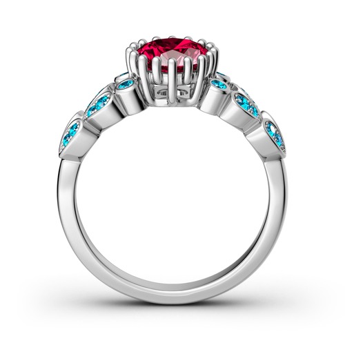 This exquisite ring perfectly portrays your love and commitment because it’s designed with love in mind. This sweet design features a sparkling heart-shaped red center stone wrapped in a halo frames of smaller round stones. Additional stones adorn the shank to complete this elegant look. This engagement ring is a symbol of your everlasting love….