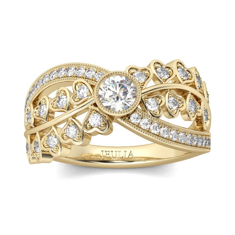 Dainty and delicate, this ring will capture your heart with its unique design. Crafted in gold tone sterling silver, the ring features its infinity shank. And the shank is sculptured with little hearts with shimmering stones set on it. A bigger round-cut stone is set at the center to complement the brilliance. Infinity is one…