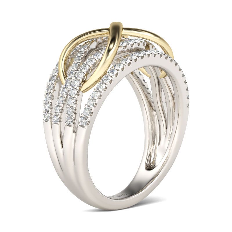 Your relationship was built on romantic moments and memorable events – make a commitment to your future with this sparkling promise ring. This touching piece showcases intertwining strands that represent two lives – and two distinct stories – as they blend together and become one. Crafted in two tone sterling silver, radiant with a brilliant…
