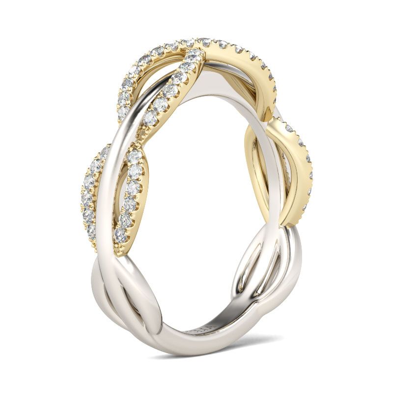 Dainty and delicate, this ring makes an adorable gift for loved one or yourself. Crafted in two tone sterling silver, the ring features a rose gold tone cable design shank intertwined with a glistening ribbon, which shows a unique and elegant look. Two round stones shimmer at the center to complement the design and add…