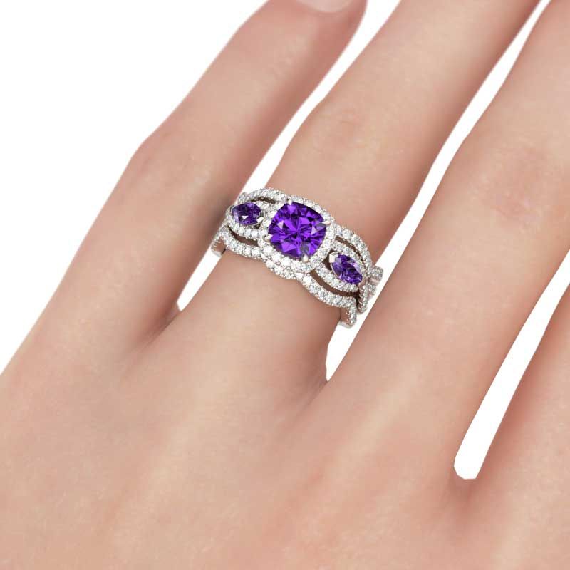 Express your love and commitment with this stunning 3PC bridal set. Expertly crafted in sleek sterling silver, the engagement ring features a purple cushion cut center stone wrapped in a halo frame of round stones, and flanked by two purple marquise cut stones. Additional stones adorn the twisting shank for extra shimmer. On your wedding…