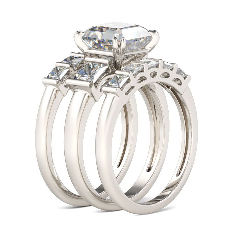 Marriage is one of the most significant milestones in life. This stunning three piece bridal set marks the moment in which you make a lasting commitment to the person with whom you share an unbreakable bond. This design features a sparkling asscher cut stone at the center, while additional princess cut stones glisten on the…