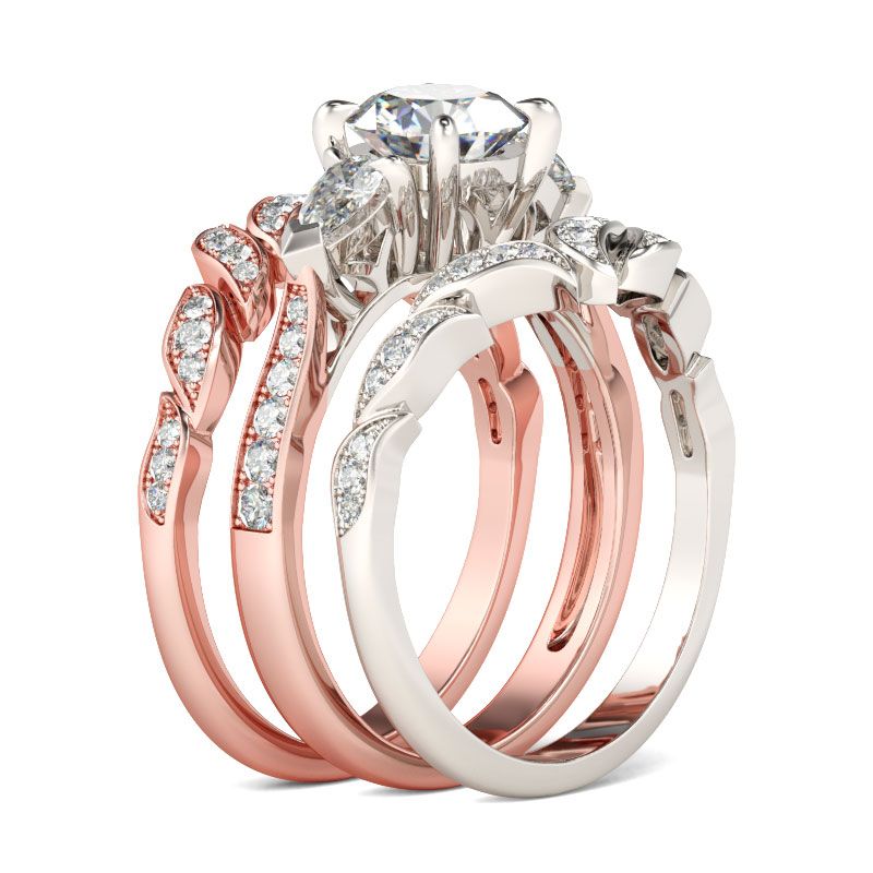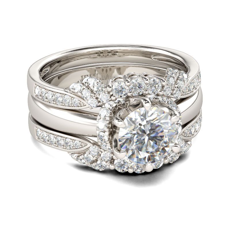 Stunning and sparkling, this three-piece ring set will capture your heart at first sight. Crafted in two tone sterling silver, the engagement ring features a three-stone design on a classic shank. The two coordinating bands are sculptured in leaf shape to protect the engagement ring and add extra sparkle to the ring set. Treat yourself…