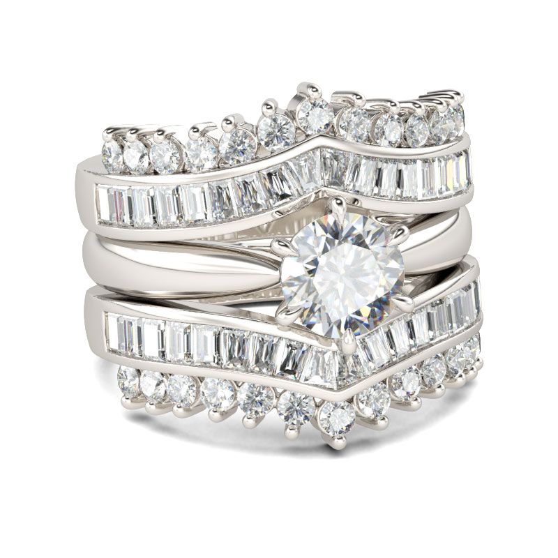 Shining with undeniable radiance, this ring set is eye-grabbing. It features a sparkling round cut center stone with two contoured bands. Each band decorated by two rows of stones-one sparkling emerald cut stones and the other round stones – that curve at the center. This ring set shimmers with all your beautiful moments to come….
