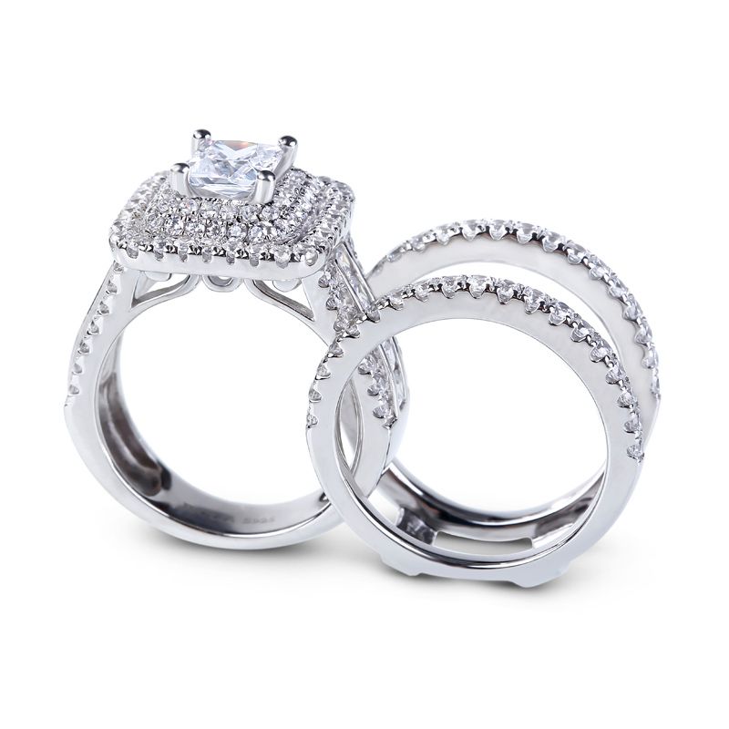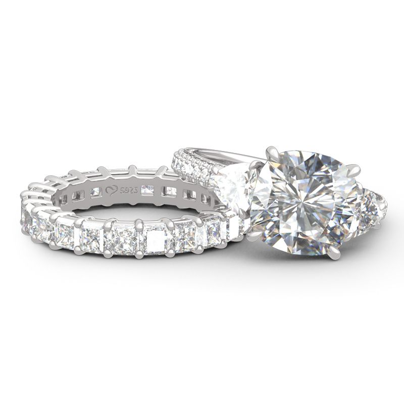 Sparkling and stunning, this three-stone ring set will capture your heart at first sight. The three main stones featured on these rings symbolize a couple’s past, present, and future.This beautiful representation makes three stone rings an especially romantic choice. Crafted in sterling silver, the engagement ring features a cushion-cut center stone accented with two trillion-cut…