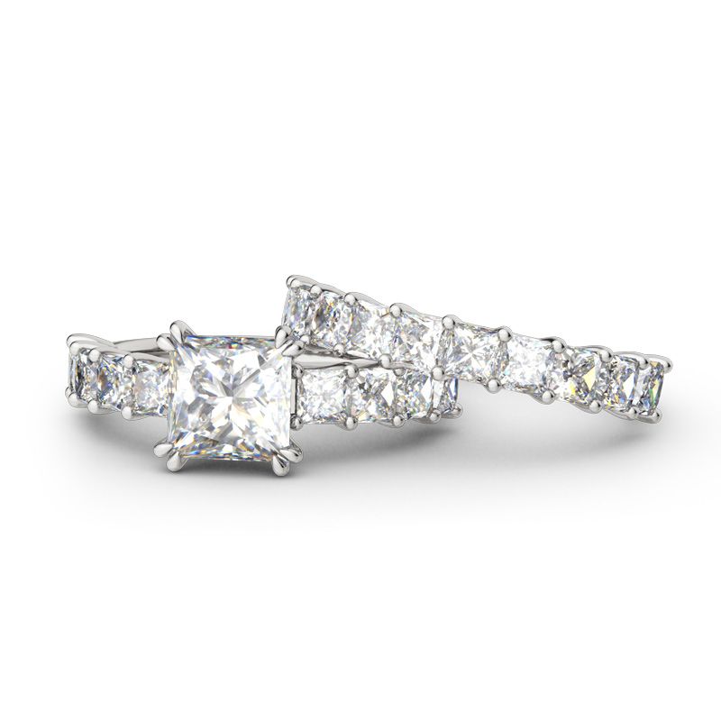Classic, elegant and symbolic of your everlasting love, this ring set will win her heart. It showcases a sparkling princess-cut center stone that catches the eye. Additional princess-cut stones adorn the ring’s shank and coordinating band. On your special day, the coordinating band completes this unique and intriguing ensemble. An awesome look of love, this…