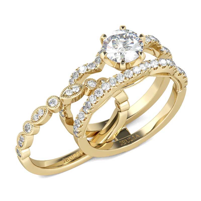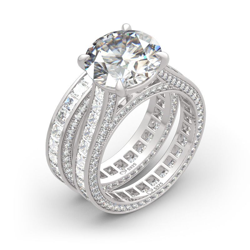 Crafted with care in every detail, this sparkling ring set displays an impressive level of artistry. A round cut stone shines brightly at the center, while additional stones adorn the ring’s shank in three sides, creating a truely dazzling look from any angle. On your special day, a coordinating eternity band completes this fabulous ensemble….