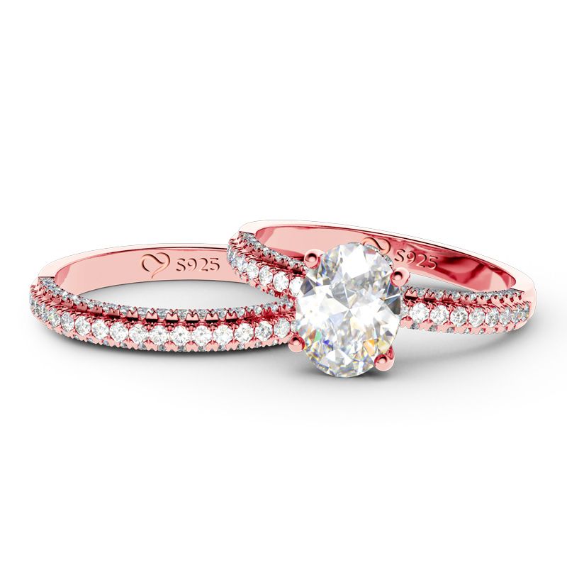 Sparkling and luxurious, the bridal set will capture your heart at first sight. Designed in feminine rose gold color, this style shimmers with a sparkling oval cut center stone. The ring’s shank and coordinating band are paved with round stones in three sides, creating a dazzling look from every angle. Simple and stunning, it’s certain…