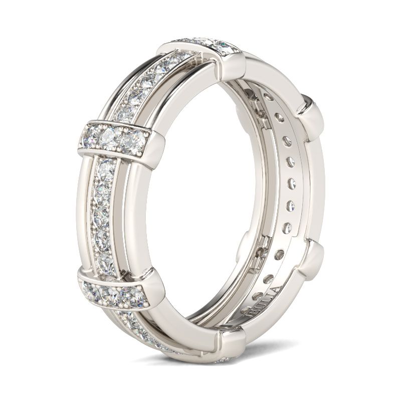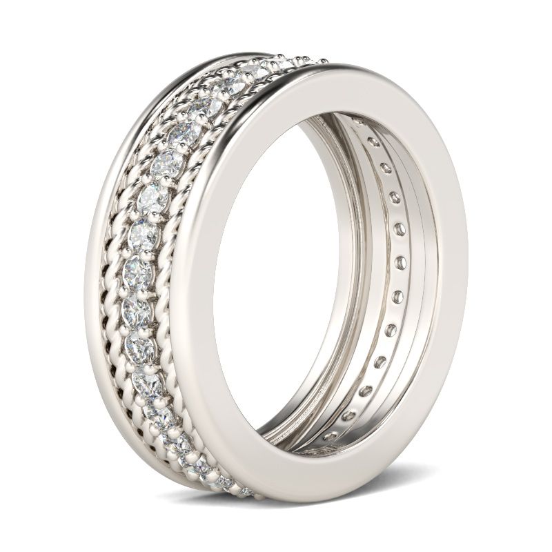 $1205.00 out of 5Surprise the man you love with this impressive band. Crafted in sterling silver, this dazzling style shimmers with a row of round stones that completely surround the band. The rope design decorate the top and bottom of this design. Simple and striking, this handsome wedding band is a shining symbol of your marriage commitment. Side…