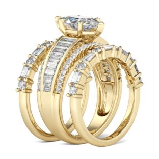 A brilliant celebration of your love, this sparkling bridal set symbolizes your unforgettable moments. This elegant ring set features a marquise cut stone at the center, and sparkling emerald cut stones are set across the center of the shank while smaller round stones grace the top and bottom of the shank, completing this exceptional design….