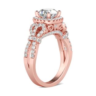 This spectacular engagement ring is the marriage of contemporary and vintage-inspired design. Crafted in fine rose-gold tone,it features a sparkling round cut stone at the center wrapped in a shimmering halo frame.While additional sparking stones decorate the ring’s impressive bowknot shank. Glamorous and classic, this exceptional ring will forever express your eternal love and undying…