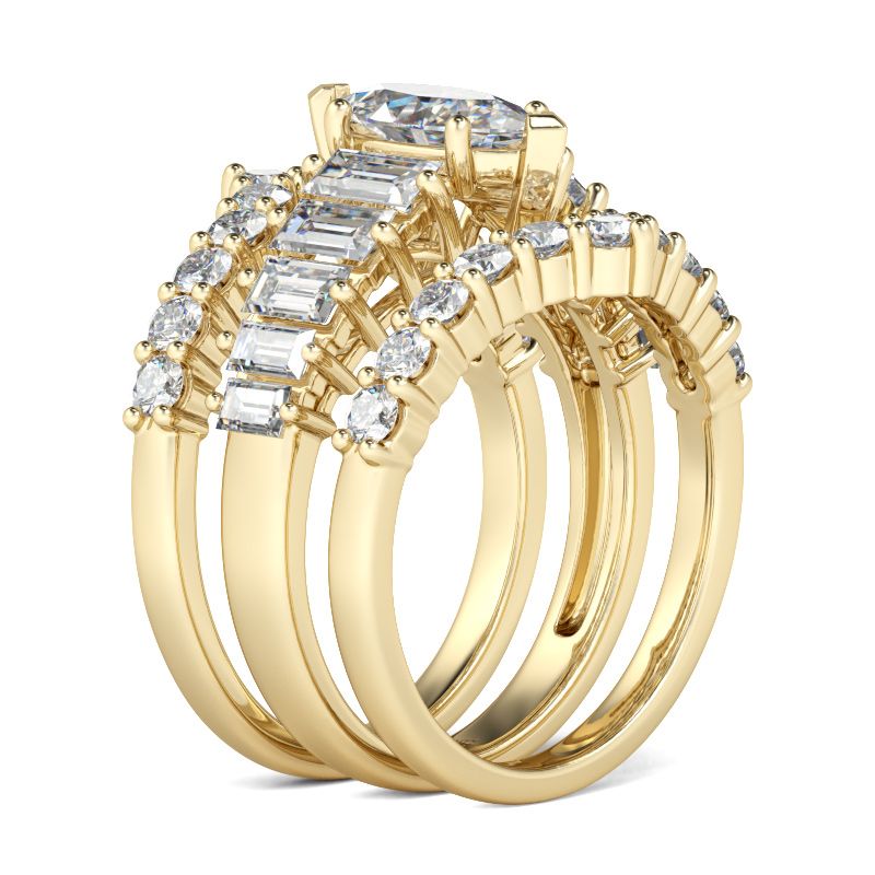 Stunning and breathtaking, this three-piece ring set honors the light of your life. Crafted in gold tone sterling silver, the engagement ring features a marquise-cut center stone set on a sparkling shank set with emerald sidestones. With two glistening coordinating bands, the ring set will sparkle crazily from every angle. Treat yourself or loved one with this piece as a holiday gift!