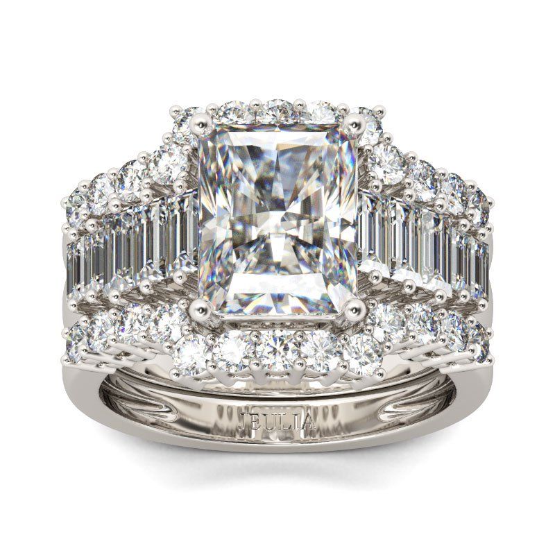 Your love shines brightly with this exceptional wedding set. This stunning wedding set features a radiant cut center stone flanked by baguette stones. Additional round cut stones are set into the matching wedding bands. All the stones sparkle perfectly from every angle, making the ring an eye-catcher everywhere. Elegant and modern, this bridal set is a look she’ll treasure.