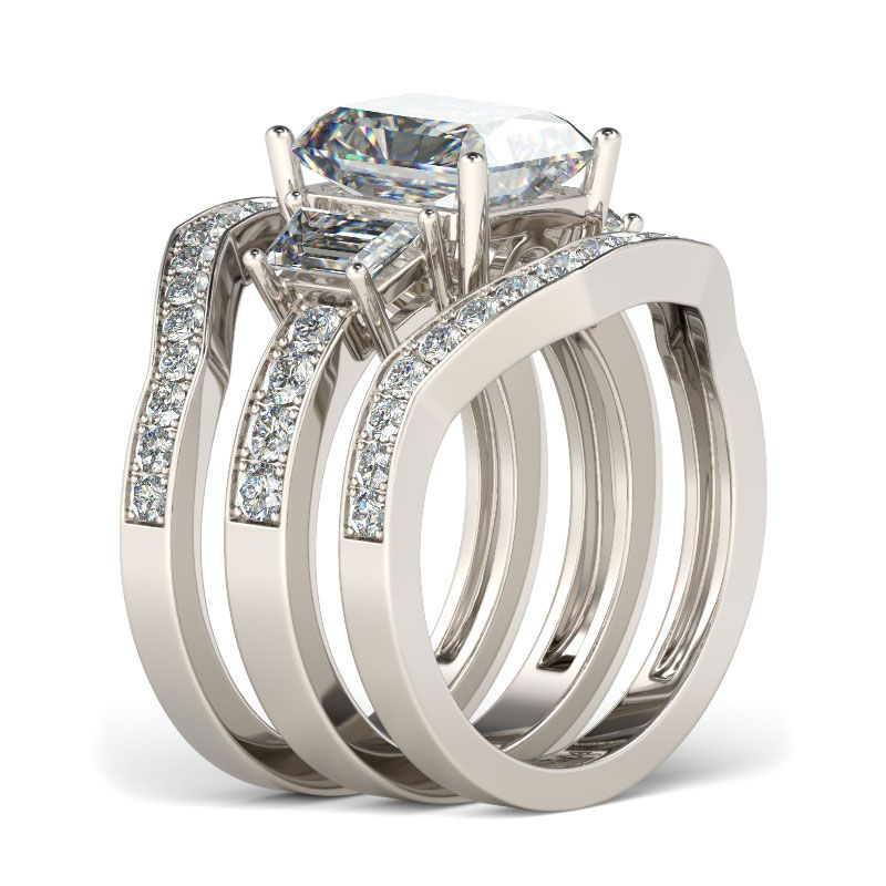 This three piece ring set shimmers with all your beautiful moments to come. It showcases a radiant cut center stone flanked by rapered baguette cut stones, while additional round stones line the shank. On your special day, two coordinating wedding bands fit closely with the engagement ring to complete this fabulous ensemble. All the stones sparkle perfectly from every angle,making the ring an eye-catcher everywhere.