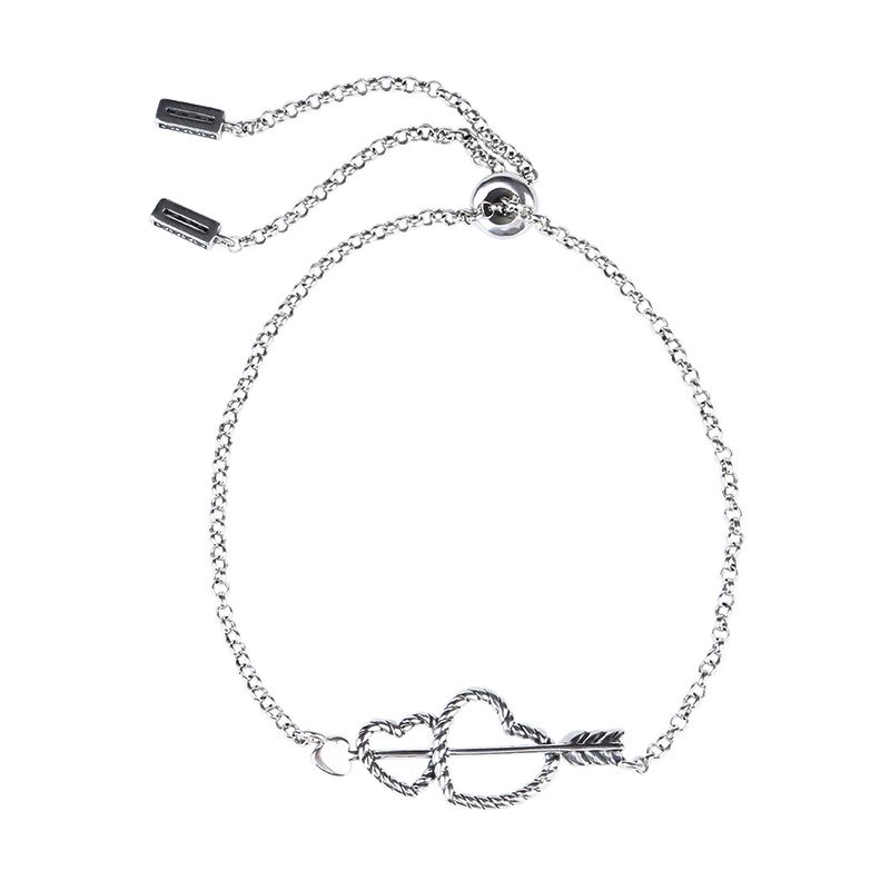 Celebrate your life with this bracelet. Crafted in oxidized silver, the bracelet shows unique and pristine beauty with its exquisite workmanship. Inspired from the Cupid’s arrow, our designer created this piece. The bracelet features a Cupid’s arrow getting through two hearts, which means love between a couple. The bolo bracelet is easy to adjust the size to fit for your wrist. Treat yourself or surprise her with this meaningful piece.