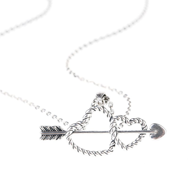 Celebrate your life with this necklace. Crafted in oxidized silver, the necklace shows unique and pristine beauty with its exquisite workmanship. Inspired from the Cupid’s arrow, our designer created this piece. The pendant features a Cupid’s arrow getting through two hearts, which means love between a couple. Treat yourself or surprise her with this meaningful piece.