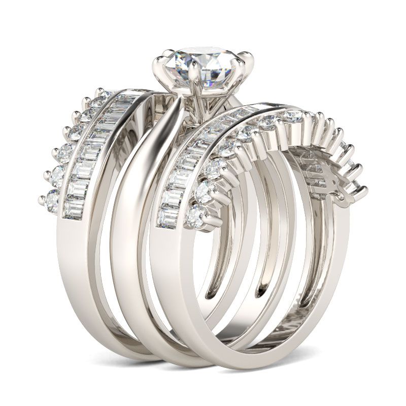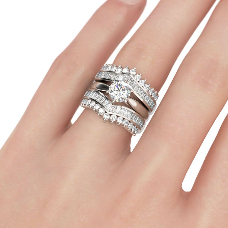 Shining with undeniable radiance, this ring set is eye-grabbing. It features a sparkling round cut center stone with two contoured bands. Each band decorated by two rows of stones-one sparkling emerald cut stones and the other round stones – that curve at the center. This ring set shimmers with all your beautiful moments to come. Increase your sparkle factor with this shimmering set.