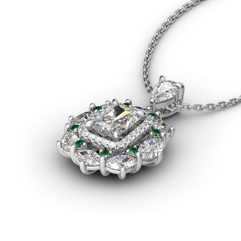 You’ll adore this sparkling vintage-inspired necklace for any special occasion – or for no occasion at all. It features a shimmering radiant cut center stone wrap in a halo frame of round stones. Marquise cut stones and green round stones wrap the centerpiece in a sparkling embrace. Exquisite and unique, this romantic choice is certain to become a treasured keepsake.