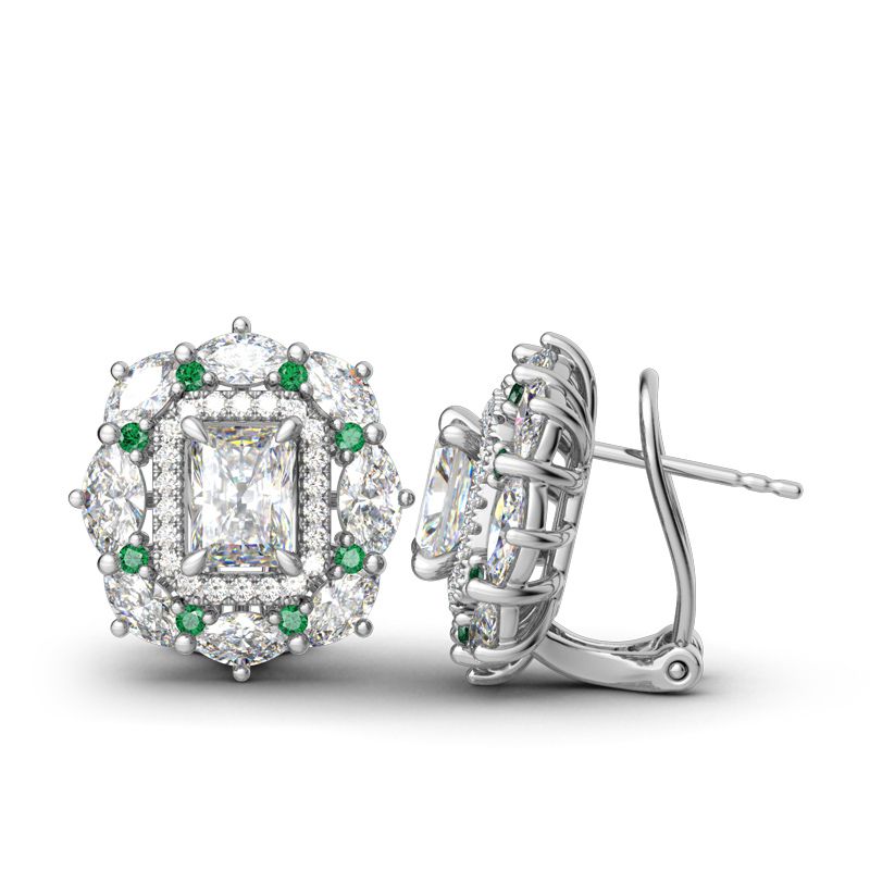 You’ll adore these sparkling vintage-inspired earrings for any special occasion – or for no occasion at all. Each earring features a shimmering radiant cut center stone wrap in a halo frame of round stones. Marquise cut stones and green round stones wrap the centerpiece in a sparkling embrace. Exquisite and unique, this romantic choice is certain to become a treasured keepsake.