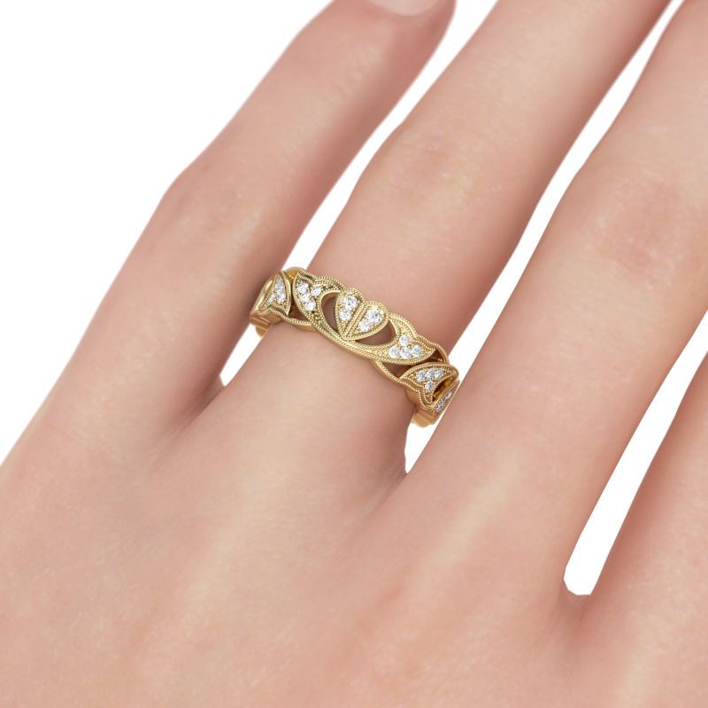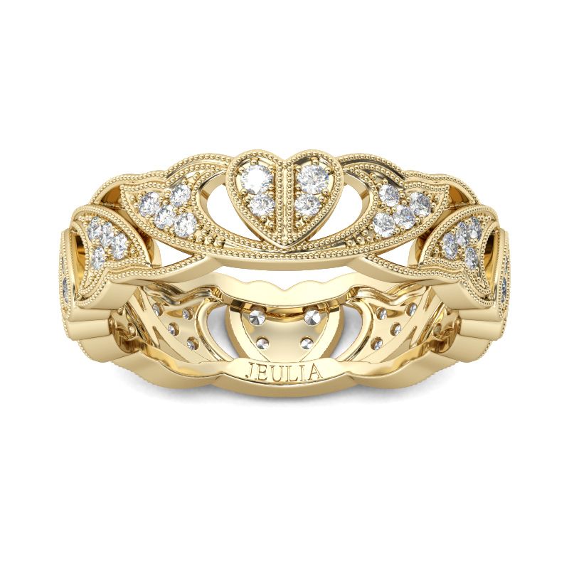 Dainty and delicate, this heart band makes a little lovely gift for loved one or yourself. Heart is one of the most popular motifs in jewelry. Crafted in gold tone sterling silver, the band features four heart frames sculptured in the cutout shank. Shimmering stones and milgrain detailing adorn the shank to create an exquisite and sparkling look for the band. It’s an adorable gift for Mom, friends or yourself.