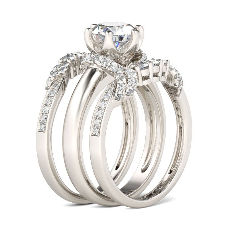 Express all the love you hold in your heart with this exquisite bridal set. Crafted in sterling silver, the stunning engagement ring features a bright round cut center stone flanked with collars of smaller stones. The coordinating bands also sparkles with round stones. All the stones sparkle perfectly from every angle,making the ring an eye-catcher everywhere.