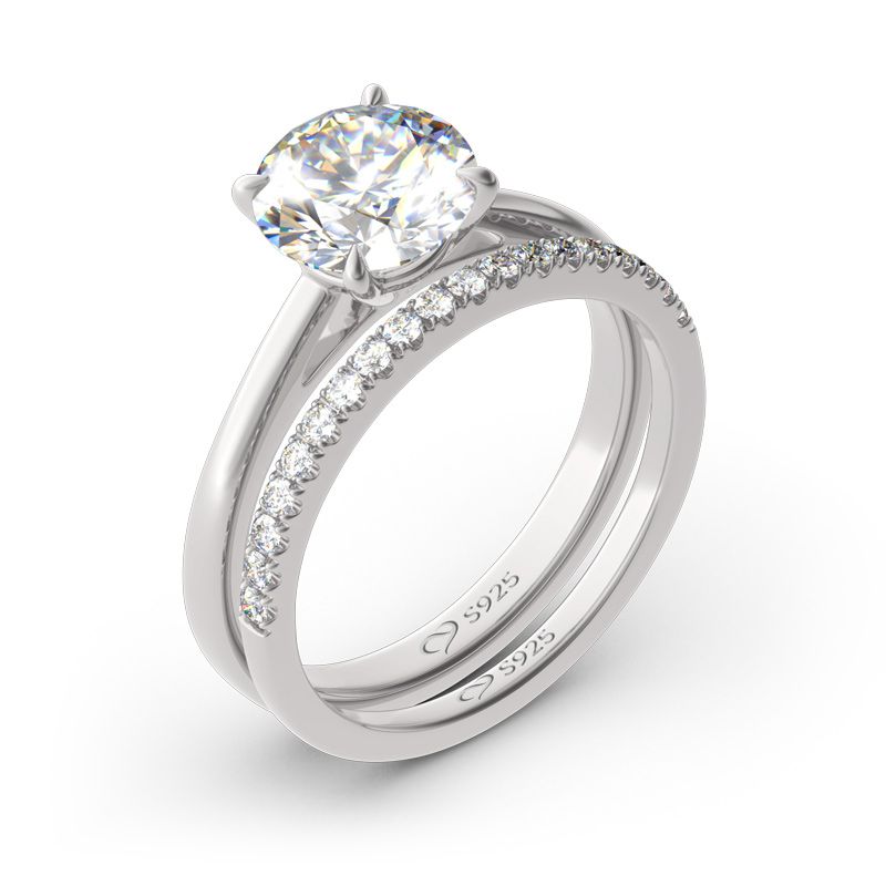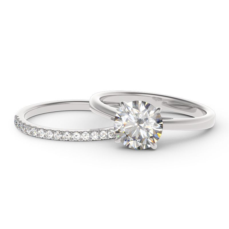 Classic and elegant, this bridal set is a brilliant celebration of your love and commitment. The engagement ring showcases a round center stone standing tall in a traditional four-prong setting. On your wedding day, the coordinating wedding band seals your vows of love. It’s designed to sparkle for a lifetime.