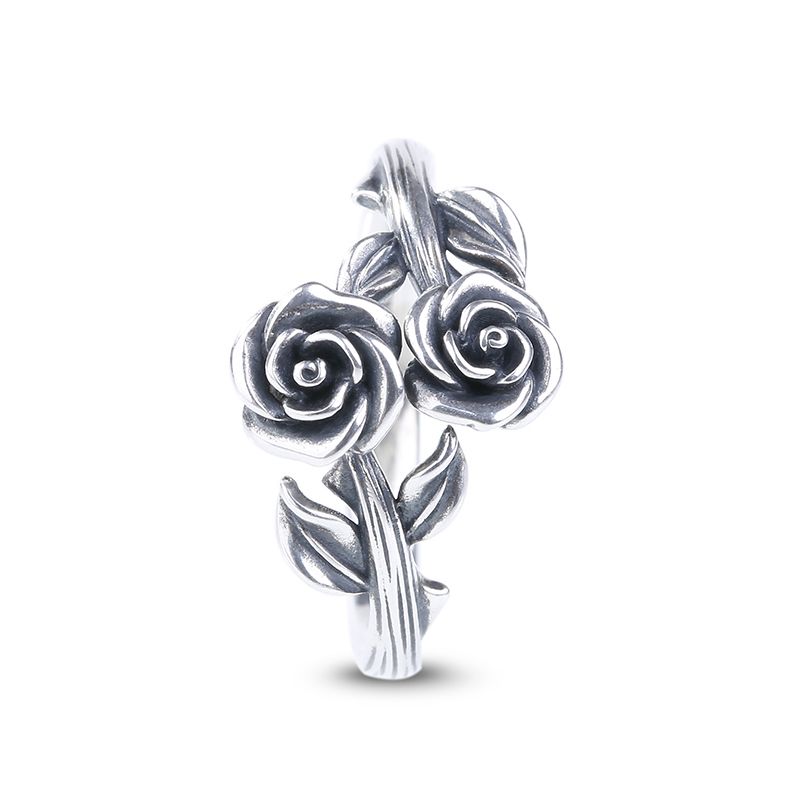 This ring features two cross roses on the shank. Crafted in oxidized silver, the ring shows a unique look. The rose branches are delicately crafted with vivid grooves. It is a good choice for fans of oxidized silver jewelry. Never miss it!