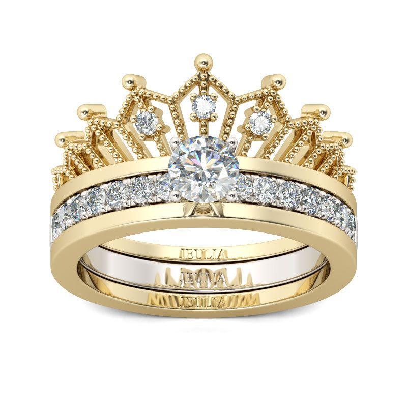 Here is your chance to feel like a queen. Glistening with detail, the shimmering engagement ring is decorated with round stones, while the enchancer is inspired by a crown. This ring set is a royal look that celebrates any special occasion. Treat yourself, or send a hint to a special someone. You won’t be disappointed.