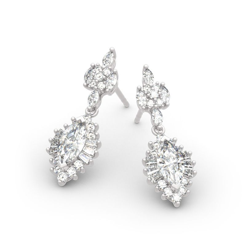 Celebrate one of the most unforgettable moments of your life with this joyous expression of love. Each earring features a marquise cut stone wrapped in a halo frame of baguette and round stones. Glittering in bold brilliance, additional stones add more sparkle. All the stones sparkle perfectly from every angle, making these earrings an eye-catcher everywhere.