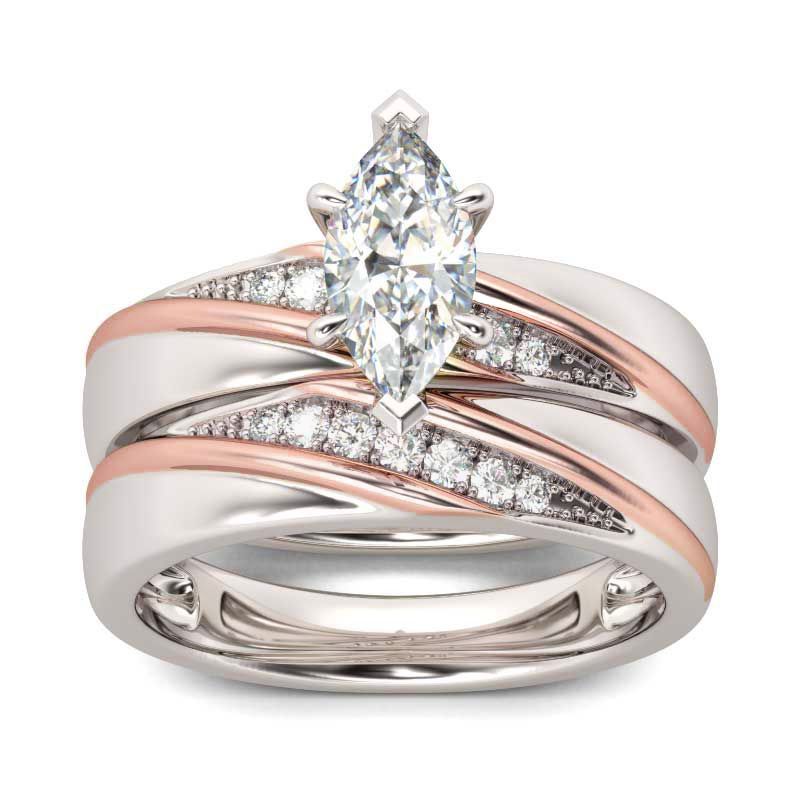 When you ask her to be yours, present her with this magnificent ring set. The marquise main stone and the two tone design make it a unique symbol of romance. Round stones glisten in diagonal pattern along the sides, brightening the sterling silver band. It symbolizes your vow to love and cherish her.