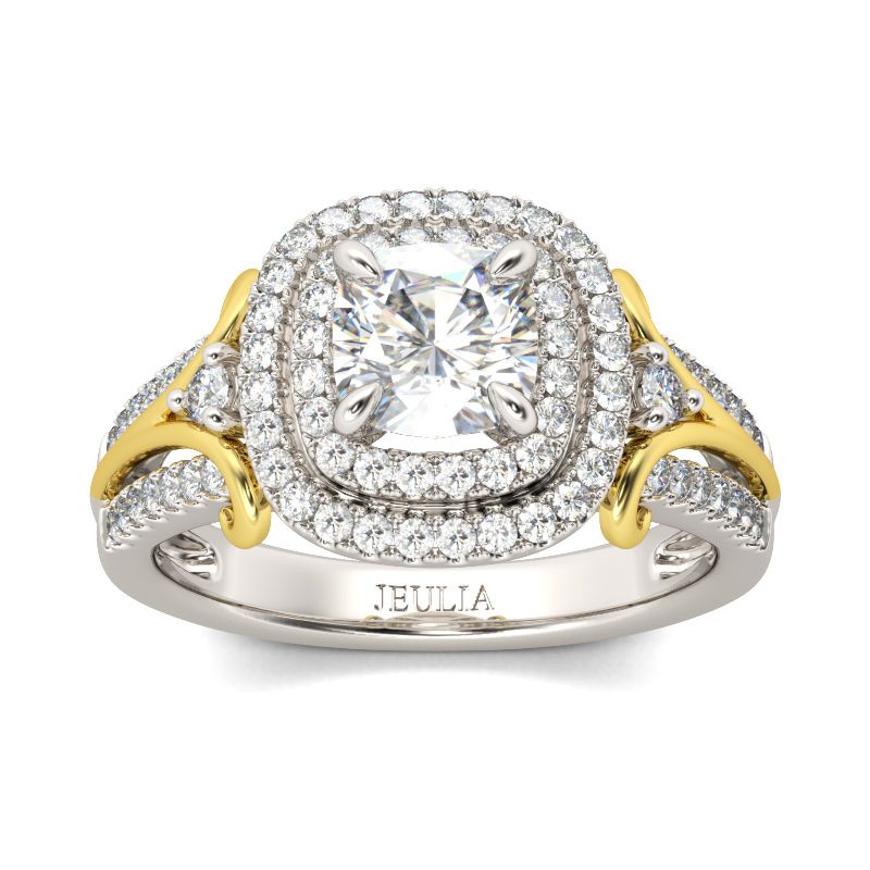 On the day you ask for her hand, enchant and delight her with this beautiful double halo ring. A brilliant cushion cut stone is wrapped in double halo frames of sparkling round stones. Ribbons of side stones complete the ring’s graceful split shank. Polished to a bright shine, this magnificent ring affords her undeniable glamour.