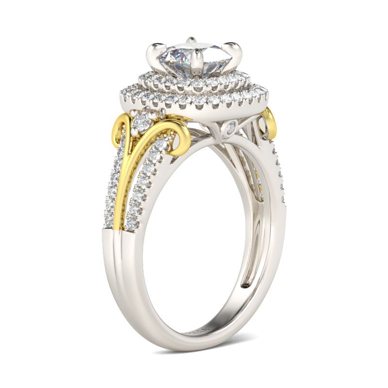 On the day you ask for her hand, enchant and delight her with this beautiful double halo ring. A brilliant cushion cut stone is wrapped in double halo frames of sparkling round stones. Ribbons of side stones complete the ring’s graceful split shank. Polished to a bright shine, this magnificent ring affords her undeniable glamour.