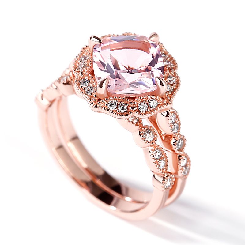 Floral Halo Cushion Cut Synthetic Morganite Sterling Silver Ring