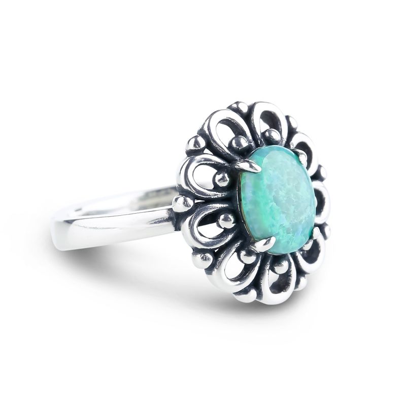 Experience the unique charm of the opal. Crafted in oxidized sterling silver, the ring will showcase a unique look on your finger. The floral like carving embraces the oval-shaped green opal. The ornate craft to the stone adds more fascination to the whole piece. Treat yourself or delight her with this dainty and delicate piece.