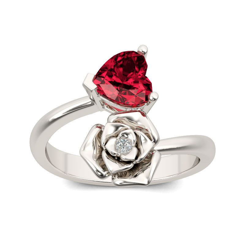 Uniquely designed to be noticed, this bypass ring makes the fashion grade. At the center, a charming rose and red heart-cut stone represent beauty and love. A delightful design you are certain to love, this ring is a romantic treasure.