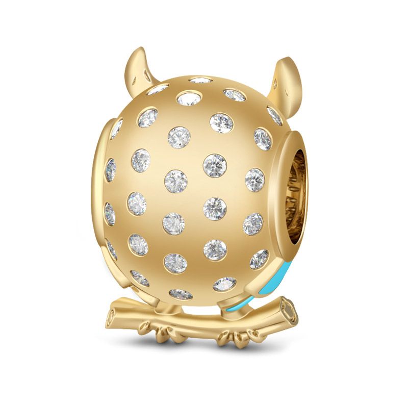 Gleaming champagne eyes peep from beneath the swooping brow of a gold owl standing on the branch. The shiny charm symbolizes insightful, wise, protective and mystic qualities and, thus, makes a meaningful gift for wise women and night-owls.