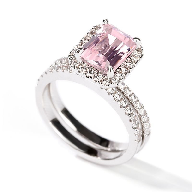 Halo Emerald Cut Synthetic Morganite Sterling Silver Ring Set