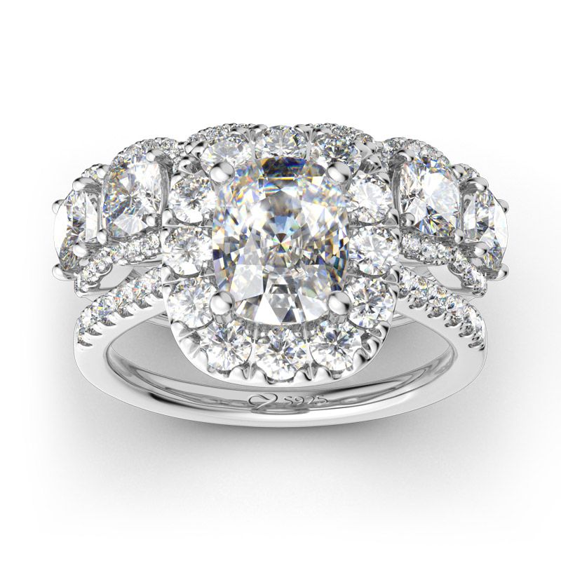 An amazing look to symbolize your loving commitment, this ring features a sparkling oval cut center stone wrapped in a frame of round stones, while additional round stones adorn the shank. The matching band features six shimmering halo round stones to complete this eye-catching design. This ring set is a beautiful beginning to your lasting love story. An elegant look for your hand, this ring set sparkles brilliantly in any angle.