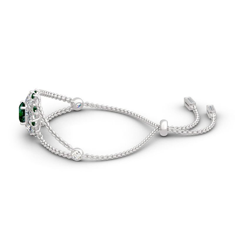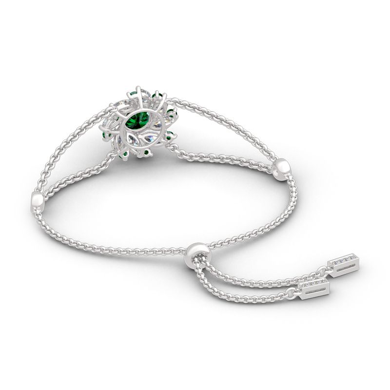 Exquisite and stunning, this bracelet will capture your heart at first sight. Inspired from ballerina’s flying skirt, it presents an elegant silhouette that will remain endlessly enchanting. Glistening double halo surrounds the emerald green center stone to create a sparkling and luxurious look. The bolo bracelet is easy to adjust to fit for every lady’s wrist. Add this masterpiece to your jewelry box and you won’t be disappointed.