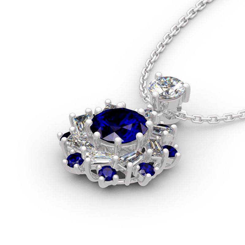 Exquisite and stunning, this necklace makes an adorable gift for loved one or yourself. Inspired from ballerina’s flying skirt, it presents an elegant silhouette that will remain endlessly enchanting. Glistening double halo surrounds the sapphire blue center stone to create a sparkling and luxurious look. Crafted in sterling silver, it’s durable and comfortable for daily wear. Add this masterpiece to your jewelrybox and you won’t be disappointed.